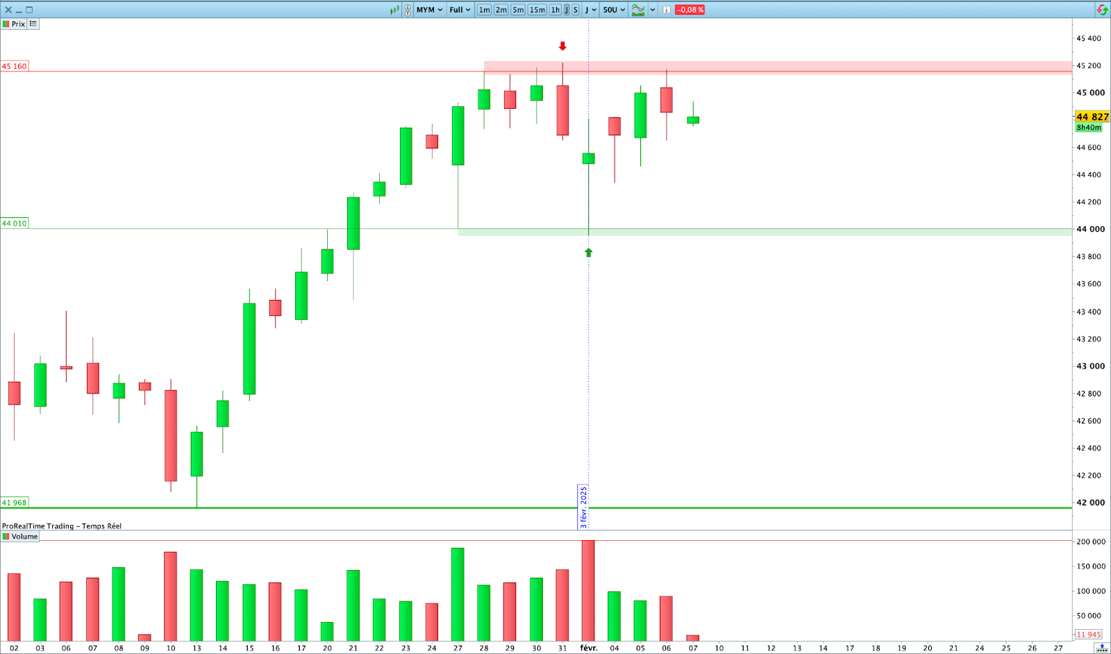 Trois jours plus tard, le 6 février, l’indice américain a cette fois-ci tenté une incursion au-dessus de sa résistance des 45160 points, mais sans succès.