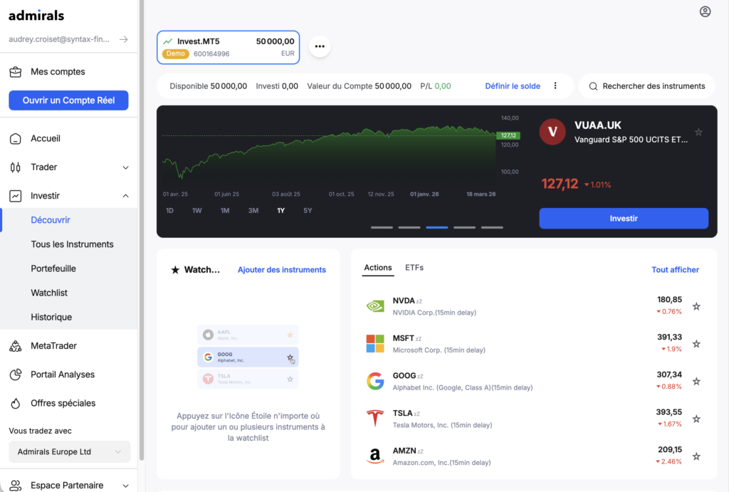 Le compte Invest.MT5 d’Admirals permet d’acheter des actions et ETF en direct.