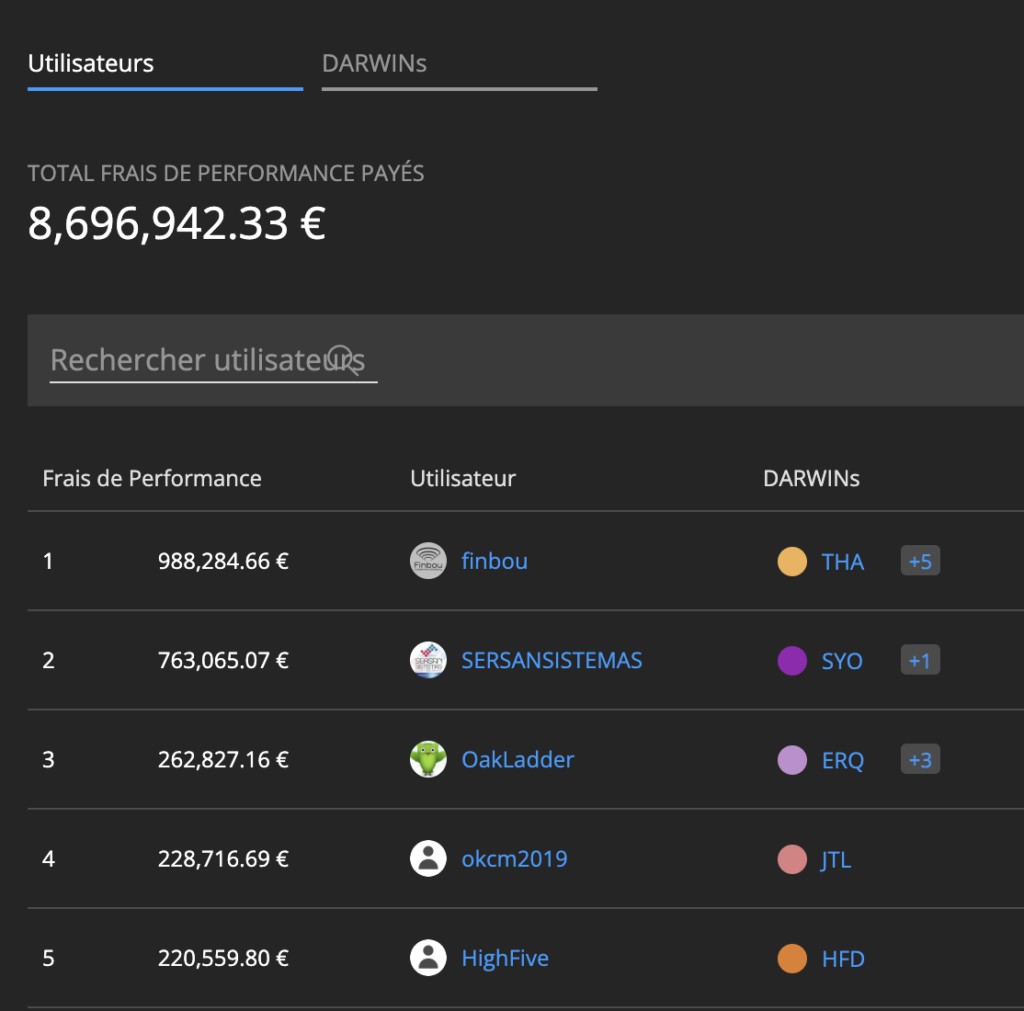 | Commissions | 15% sur profits investisseurs | 15% (réels) sur allocations DarwinIA |