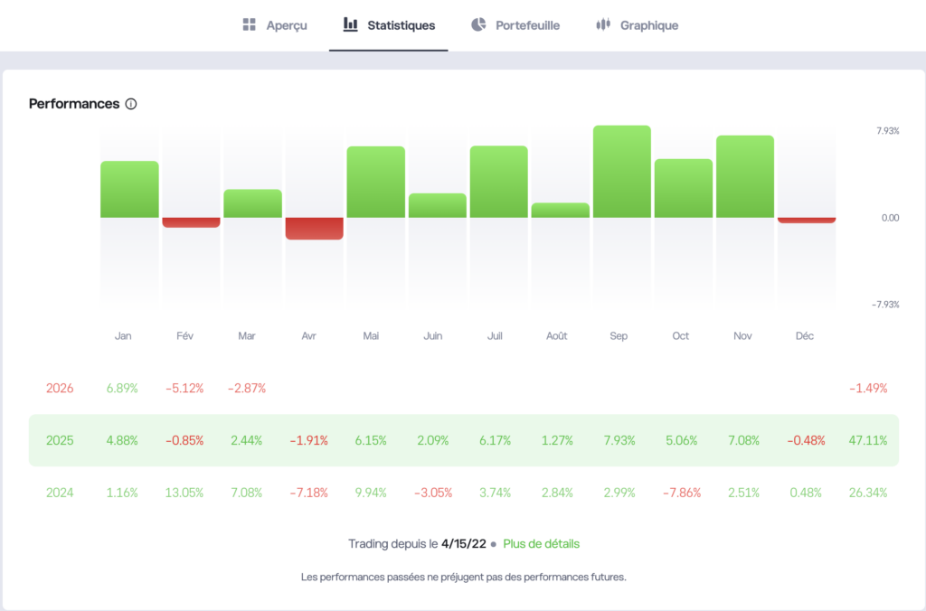 Attention cependant : copier un trader performant ne garantit aucunement des gains futurs. Les performances passées ne préjugent pas des résultats à venir et vous assumez intégralement le risque de perte en capital.