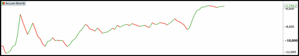 L’indicateur Accumulation/Distribution révèle si un actif est majoritairement acheté par les investisseurs (accumulation) ou majoritairement vendu (distribution).