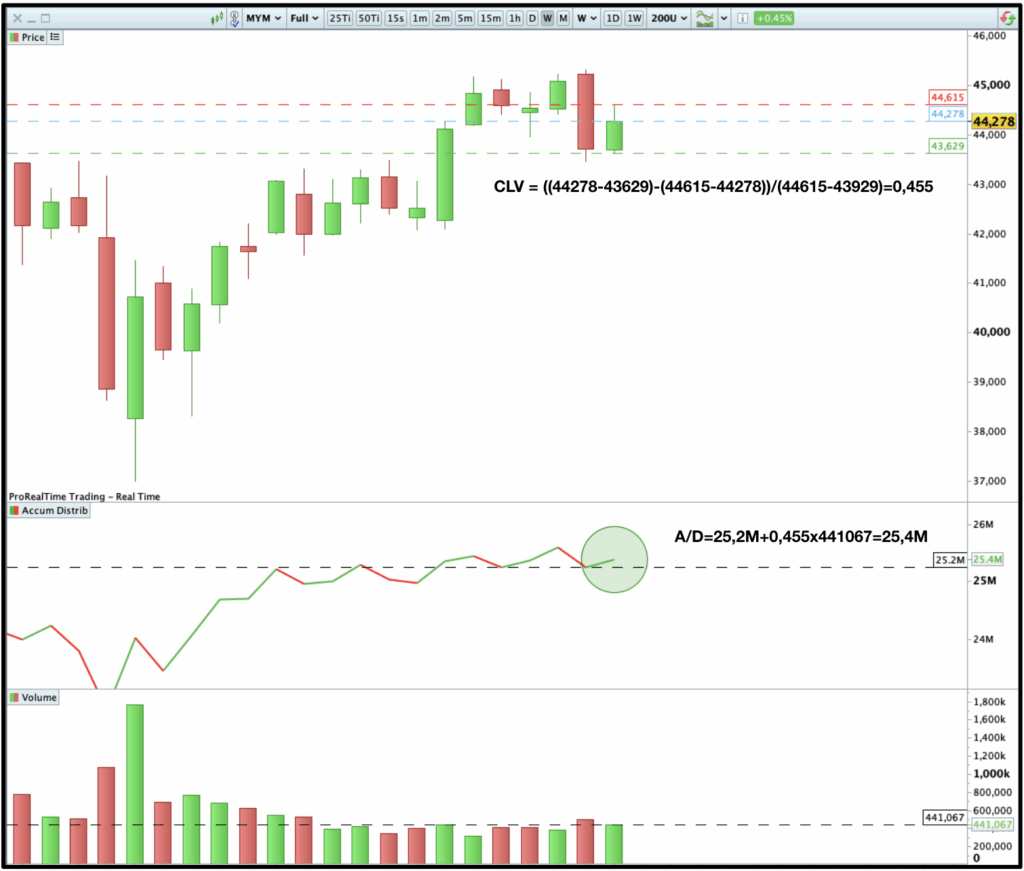 Si la CLV est positive, l’indicateur A/D augmente (accumulation). À l’inverse, si la CLV est négative, l’indicateur A/D diminue (distribution).