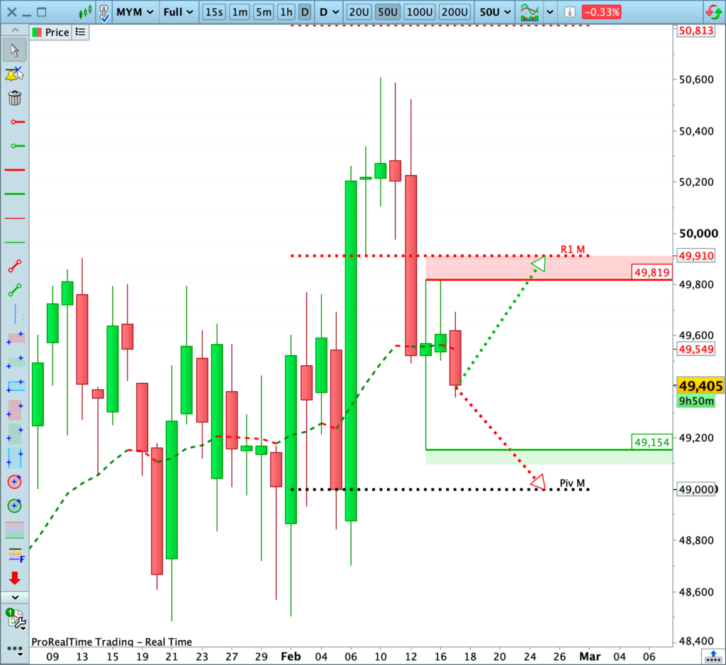 Dans ce contexte, je privilégierai donc les trades baissiers pour cette séance, avec en ligne de mire les stop-loss des acheteurs situés au-delà du support des 49154 points, puis le Point Pivot mensuel.