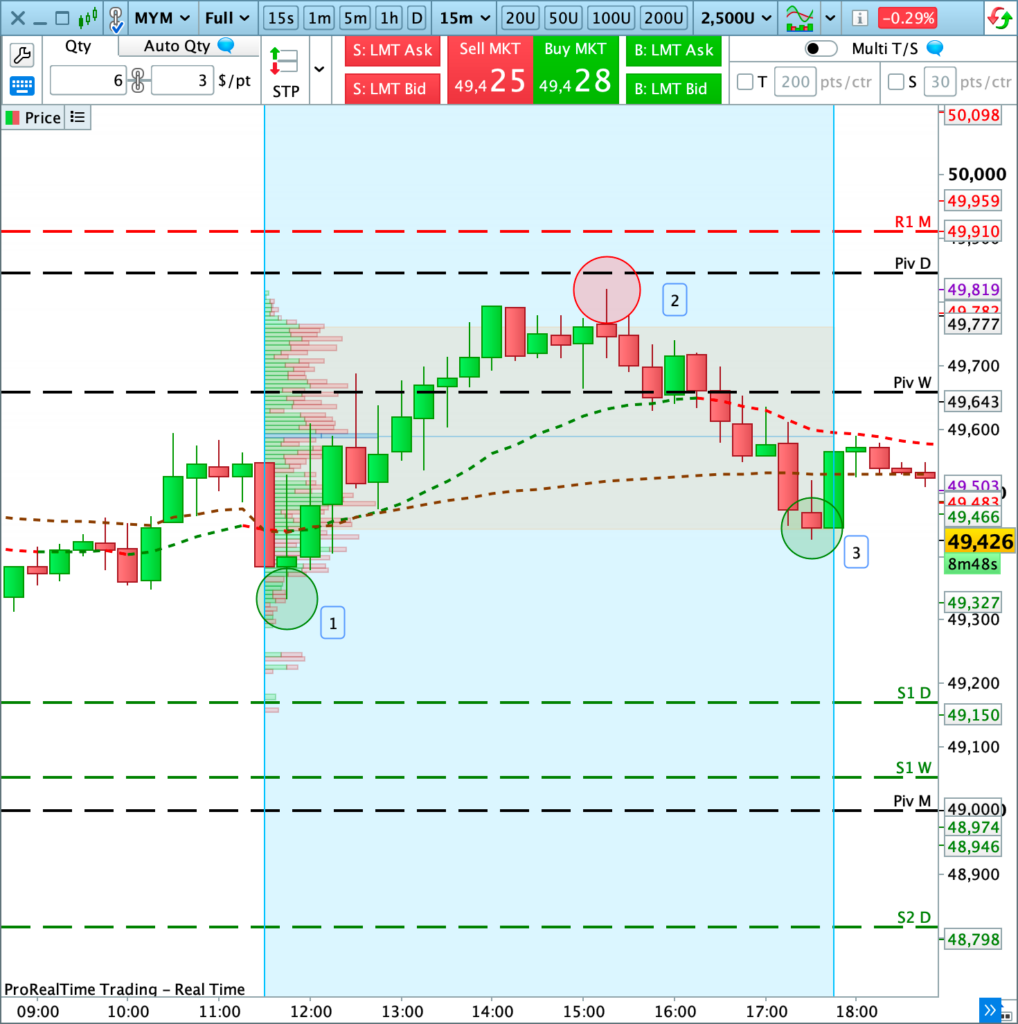 Le FOMO des vendeurs à découvert sur la bougie d’ouverture (agressions vendeuses sans relais) donnait l’opportunité au marché à rebondir [1], mais malgré leurs efforts, les acheteurs ne sont pas parvenus à rallier le point pivot journalier [2].