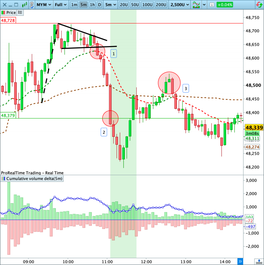 La cassure à la baisse s’est d’abord déroulée dans le déni (avec des volumes relativement faibles), mais les échanges se sont accélérés suite à la cassure du plus bas intraday [2].