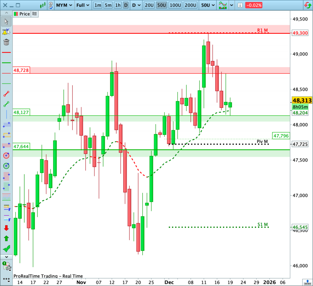 Pour ce vendredi, je chercherai en priorité à vendre pour viser les stops-loss des acheteurs piégés par le rebond d’hier (situés sous 48 127 points). Et en cas de rebond intraday trop euphorique sur cette zone, je surveillerai la possibilité d’une nouvelle impulsion baissière en direction du point pivot mensuel.