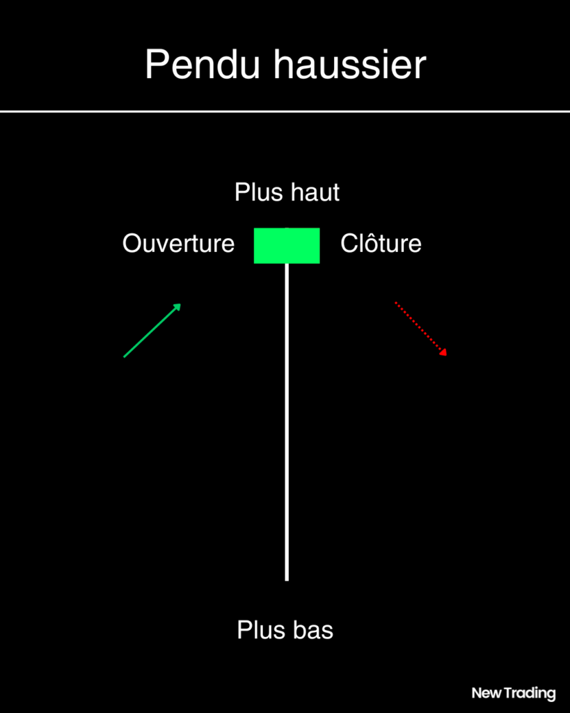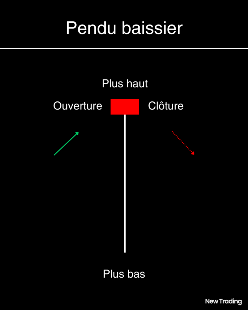 Le pendu baissier caractérisé par une clôture inférieure au niveau d’ouverture peut quant à lui indiquer une perte de vitesse de la tendance haussière et la perspective d’une correction.