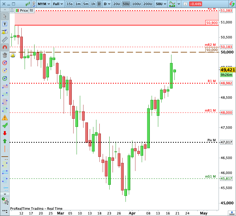 Dans ce contexte, je privilégierai donc de nouveau les trades haussiers avec pour objectif le seuil symbolique des 50 000 points (au contact duquel une correction pourrait se mettre en place).