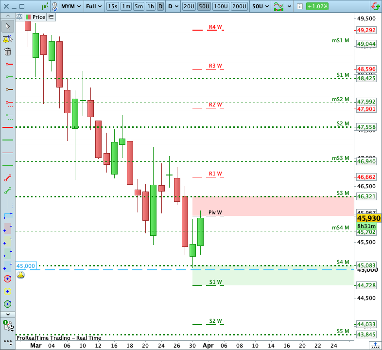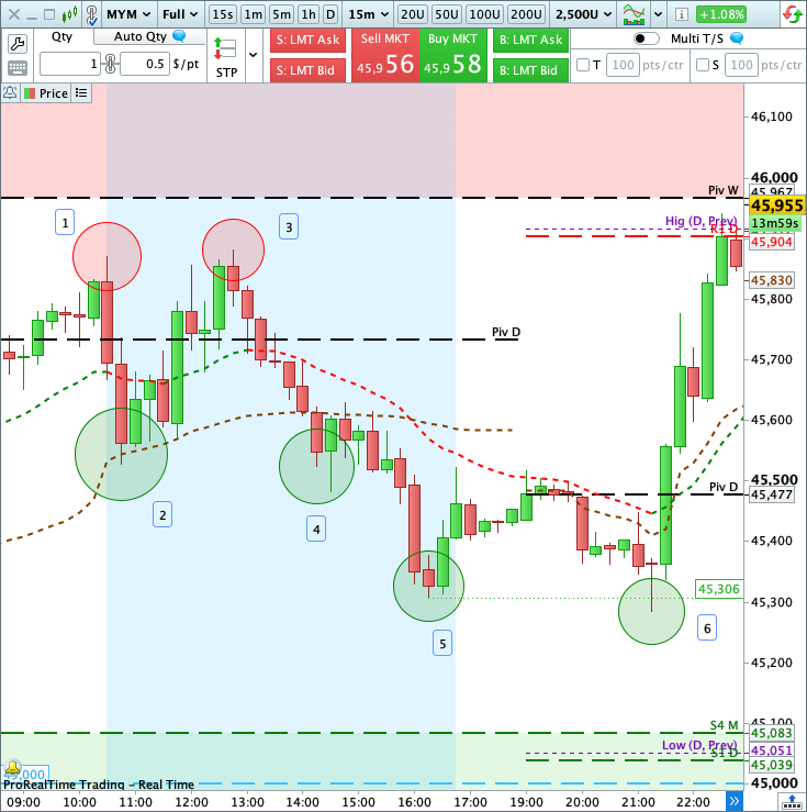 L’offensive vendeuse est alors parvenu à rallier successivement le VWAP [2] et le seuil symbolique des 45 500 points [4] avec une clôture du marché proche de ses plus bas [5] doublée d’un deuxième passage overnight sous le support intraday des 45 306 points avant que le marché ne rebondisse.