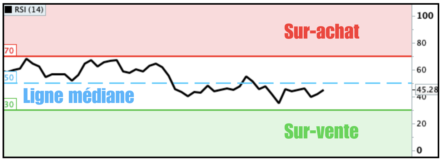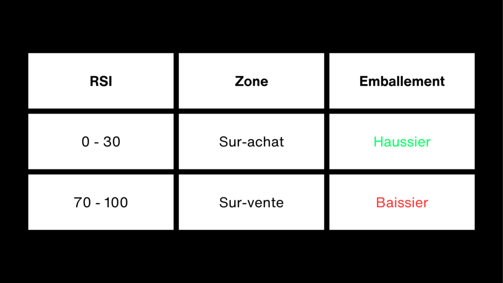 L’entrée du RSI en zone de survente (0 à 30) ou en zone de surachat (70 à 100) indique que la tendance s’emballe.