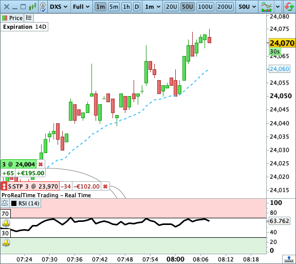 Graphique ProRealTime Web avec superposition de RSI avec différents paramètres. De période courte, le RSI(9) en rouge est le plus réactif, il est le premier à entrer en zone de surachat et de survente. De période longue, le RSI(25) est le plus lent, il est le dernier à entrer en zone de surachat et de survente. Plus neutre, le RSI(14) évolue quant à lui entre les deux.