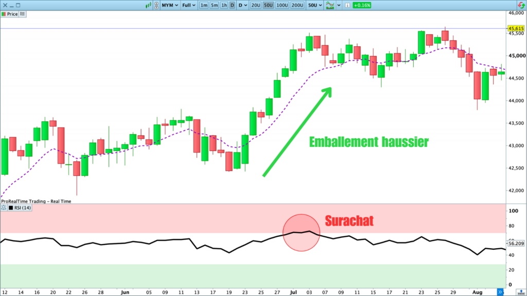 • Lorsque le RSI entre en zone de surachat (moyenne des hausses nettement supérieure à la moyenne des baisses), il s’agit d’un emballement haussier.