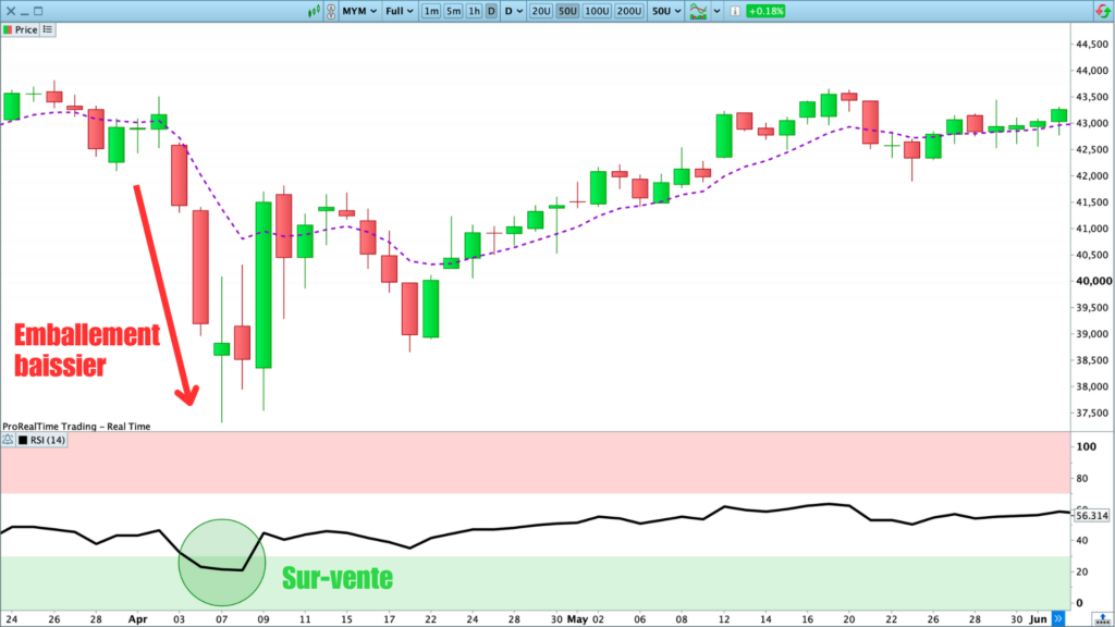 • Lorsque le RSI entre en zone de survente (moyenne des baisses nettement supérieure à la moyenne des hausses), il s’agit d’un emballement baissier.