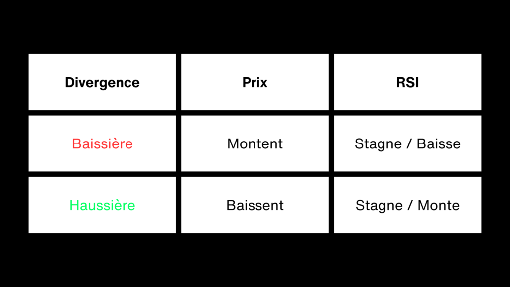 Une divergence se produit lorsque les prix et le RSI ne se déplacent pas dans la même direction.