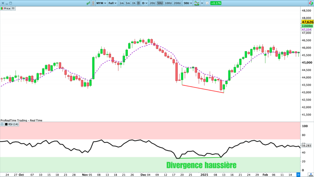 À l’inverse, les divergences haussières se produisent lorsque les prix dessinent des points bas de plus en plus bas tandis que le RSI ne baisse pas, voire qu’il monte.