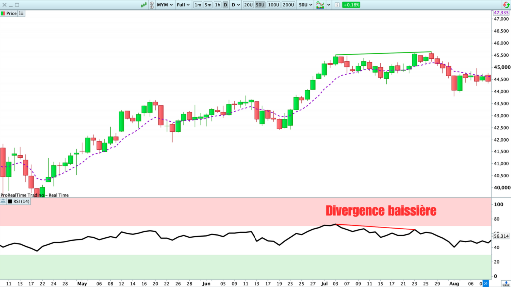 Les divergences baissières se produisent lorsque les prix forment des points hauts de plus en plus hauts tandis que le RSI ne monte pas, voire qu’il baisse.