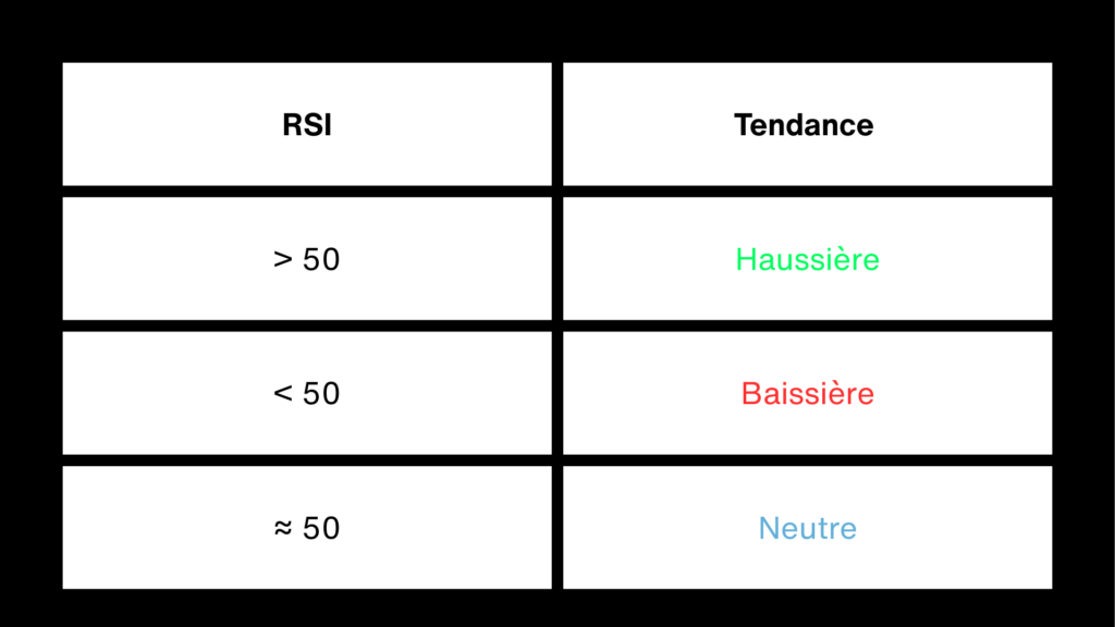 La position du RSI par rapport à sa ligne médiane indique la tendance du marché.