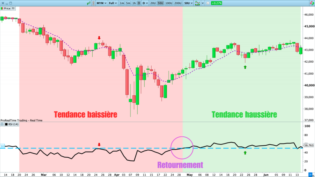 Dans cet exemple, le RSI évolue d’abord sous sa ligne médiane, ce qui indique que la tendance du marché est baissière. Puis, le RSI repasse au-dessus de sa ligne médiane, ce qui indique cette fois-ci que la tendance est haussière.
