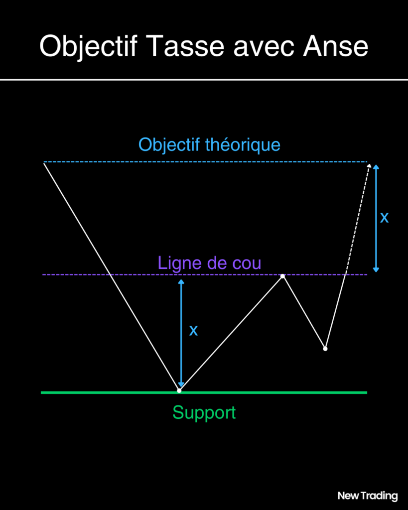 L’objectif théorique de la hausse est alors obtenu en reportant au-dessus de la résistance la profondeur de la tasse, c’est-à-dire la différence entre les sommets de la tasse et le point bas du premier creux.