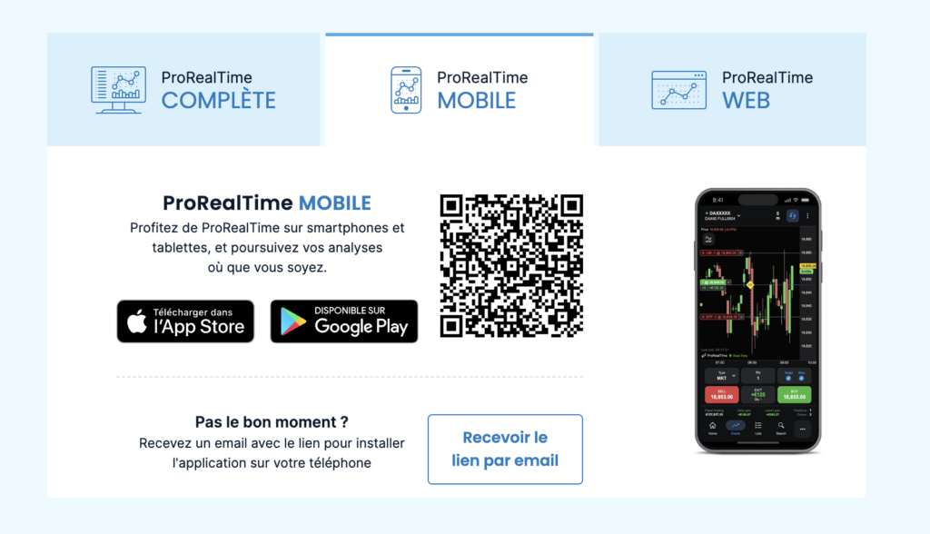 L’application ProRealTime Mobile peut également se télécharger sur votre smartphone et la version logicielle (ProRealTime Complète) sur votre ordinateur.