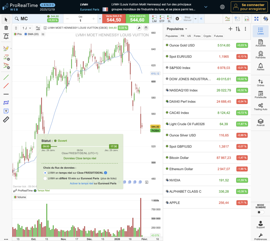 ProRealTime permet d’accéder aux données du marché en temps réel et en différé. Par défaut, les versions web et mobile donnent accès à des données en temps différé, mais vous pouvez passer à des données en temps réel gratuitement ou par le biais d’un abonnement, en fonction de l’actif sélectionné.