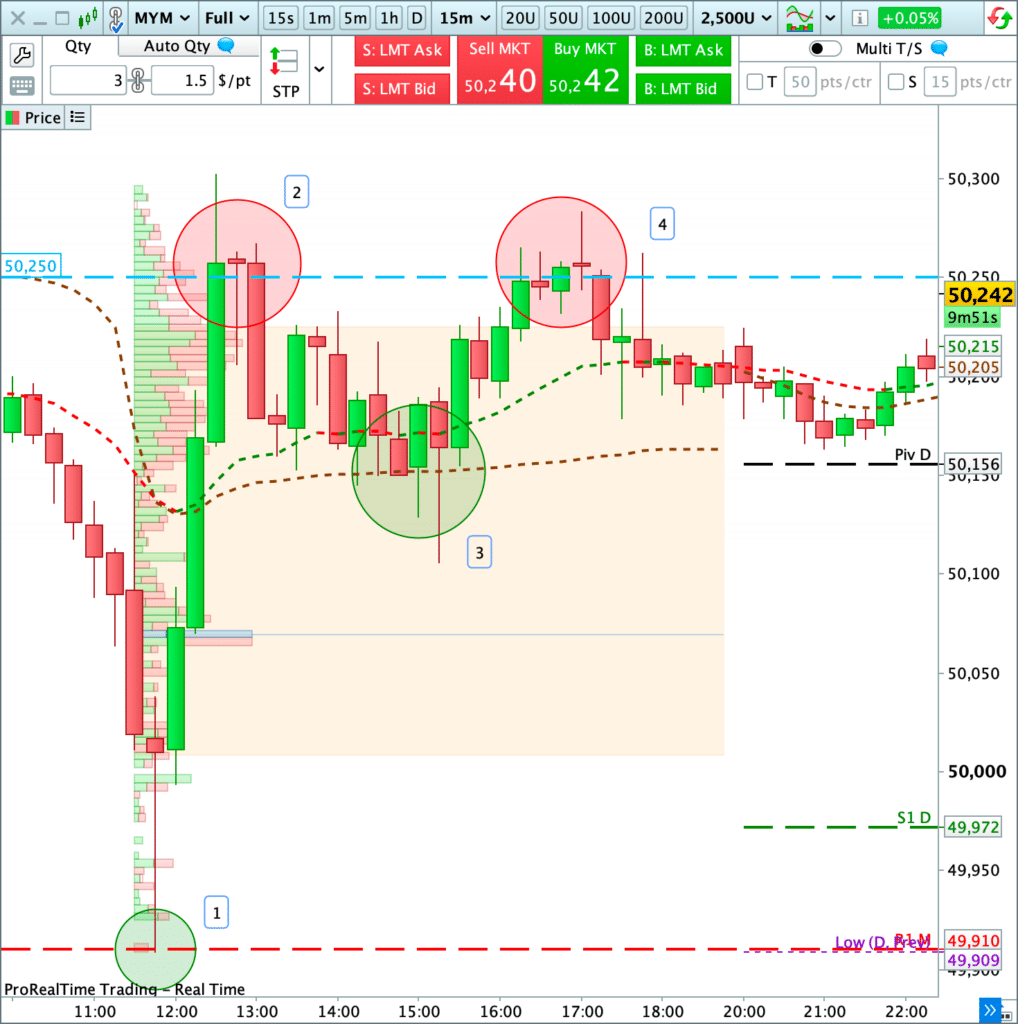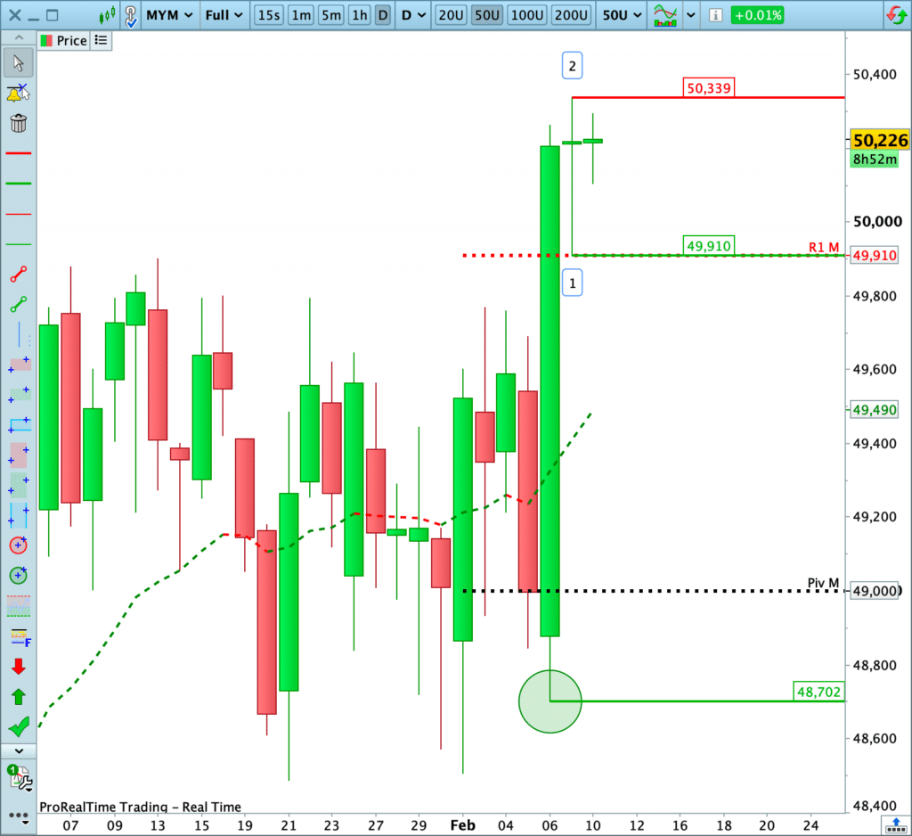 L’impulsion haussière s’est alors heurtée au seuil symbolique des 50 250 points à deux reprises [2] [4] malgré sa reprise d’appui au contact du VWAP à la mi-séance [3], mais sans corriger fortement.