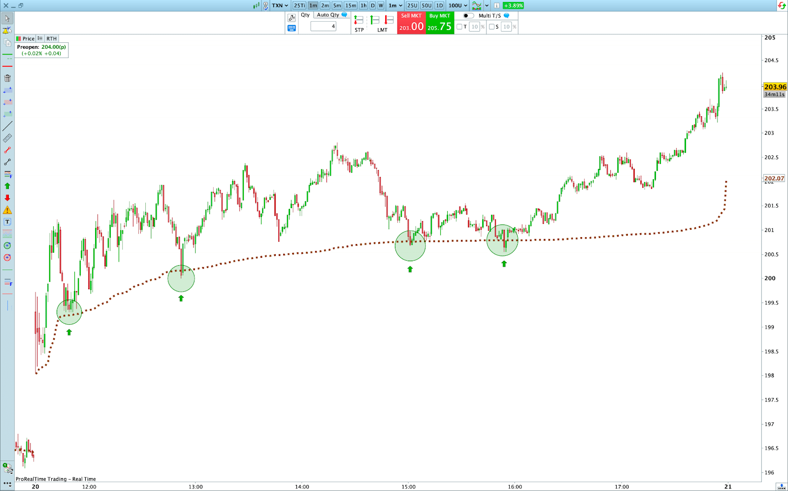 | Niveau clé dynamique de support ou de résistance | Indicateur retardé par rapport à l’évolution des prix (car ancré au prix d’ouverture) avec un décalage qui augmente au fil de la journée |