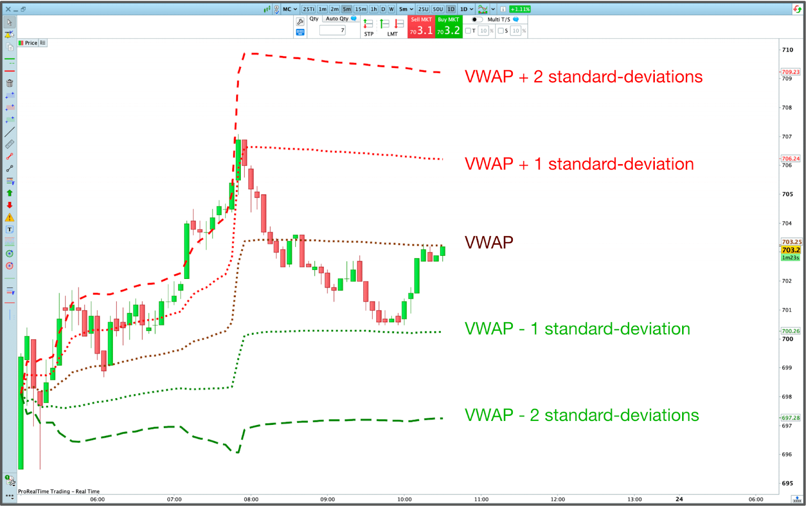 À la manière des bandes de Bollinger, les bandes VWAP sont des écarts types appliqués au VWAP, créant des limites supérieures et inférieures autour du VWAP. Utilisées comme un indicateur de momentum, elles permettent d’identifier les situations de surachat et de survente.