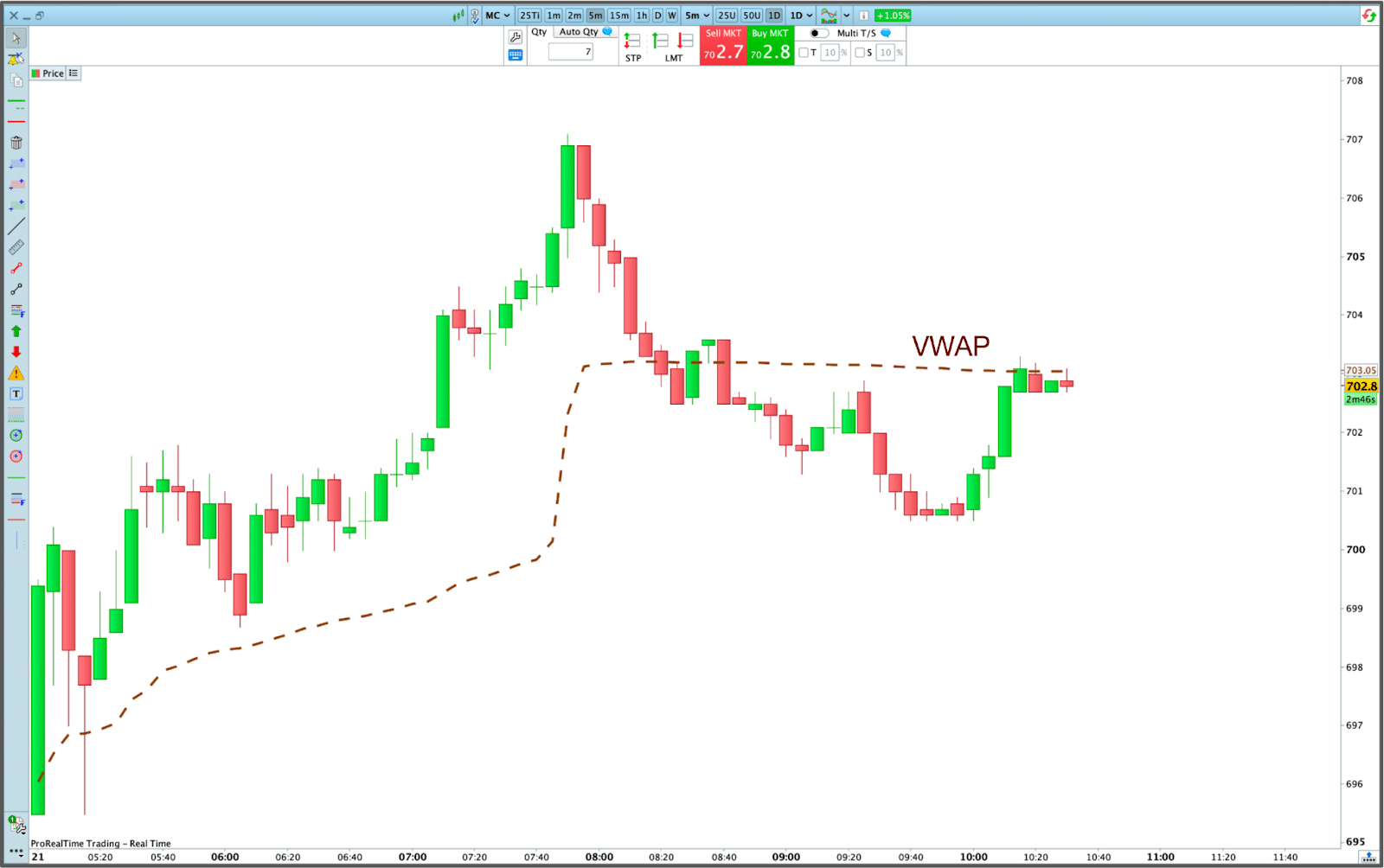 - Lorsque le prix est au-dessus du VWAP, l’acheteur moyen est dans le vert et le vendeur moyen est dans le rouge. Et inversement, lorsque le prix est en-dessous du VWAP, l’acheteur moyen est en moins-value et le vendeur moyen en plus-value.